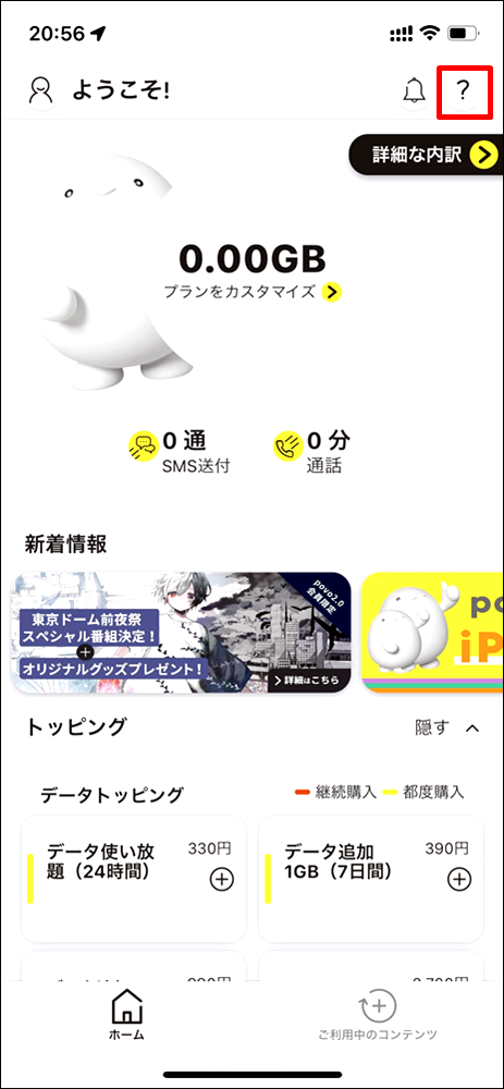画像① >povo2.0アプリを起動したら、右上の「?」をタップします。