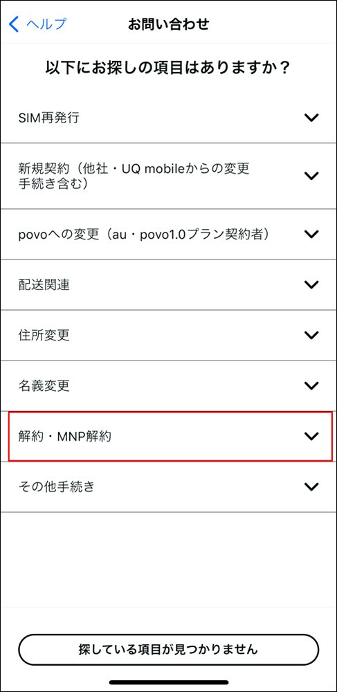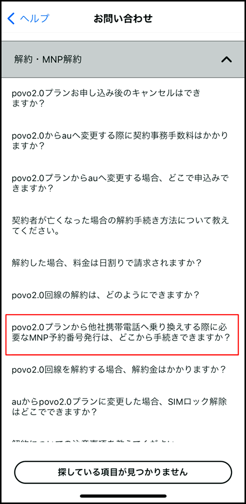 画像④ >povo2.0プランから他社携帯電話へ乗り換えする際に必要なMNP予約番号発行は、どこから手続きできますか? をタップします。