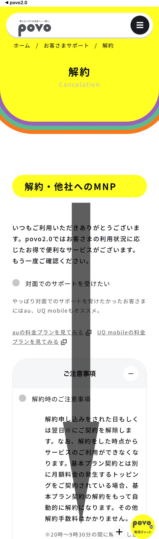 画像⑩ >「povo2.0解約時のご注意事項を確認しました」にレ点えお入れる。