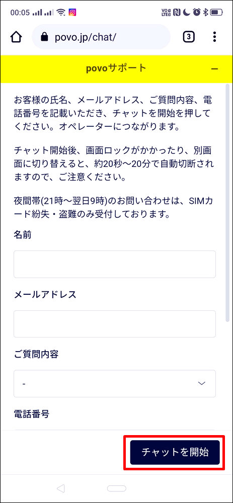 名前やメールアドレス等を入れてチャットを開始します。